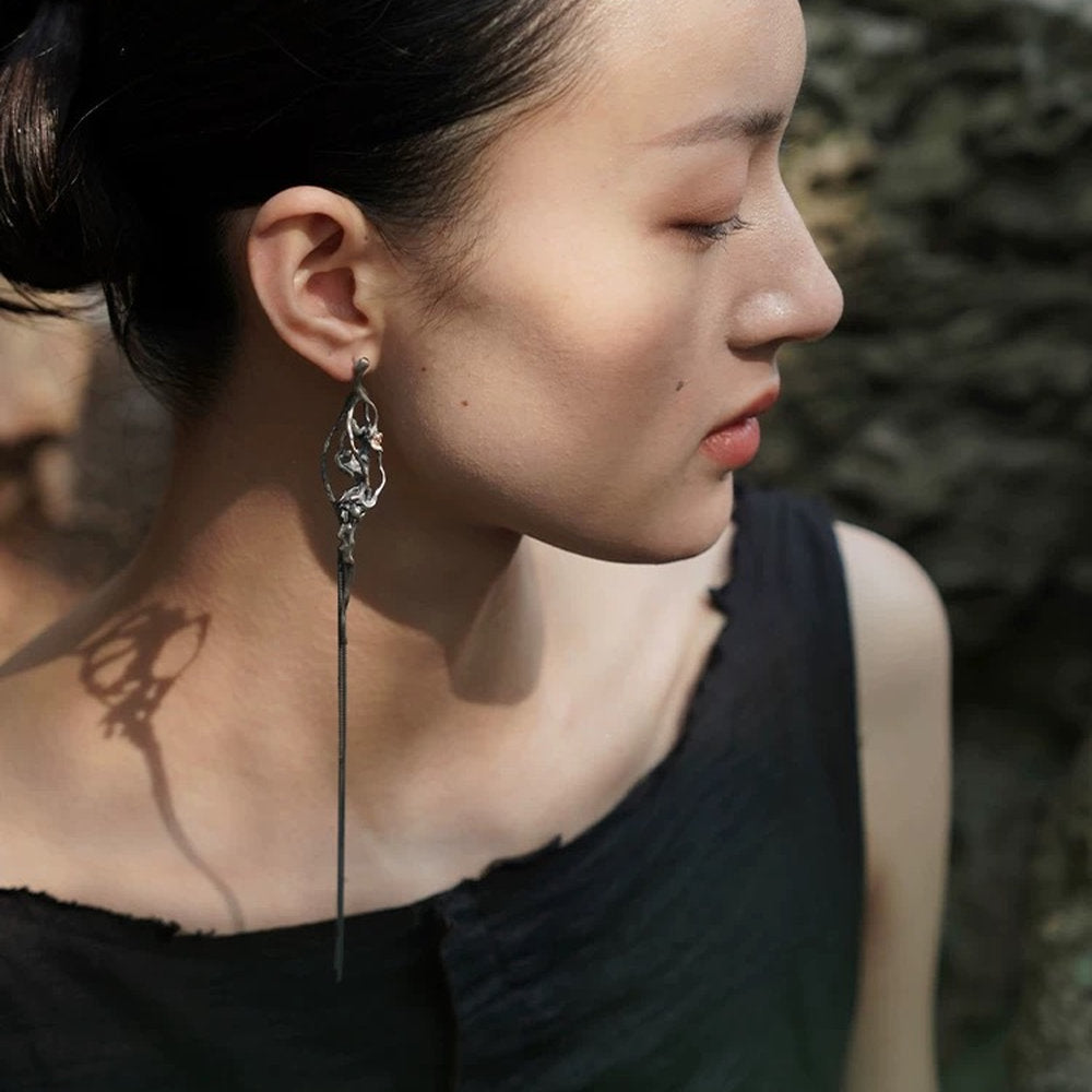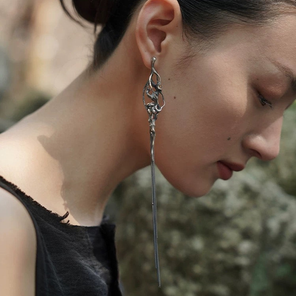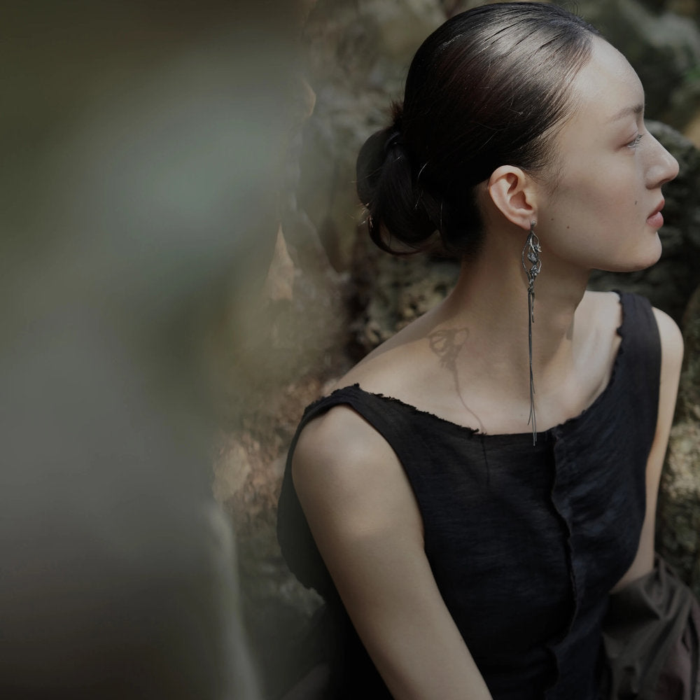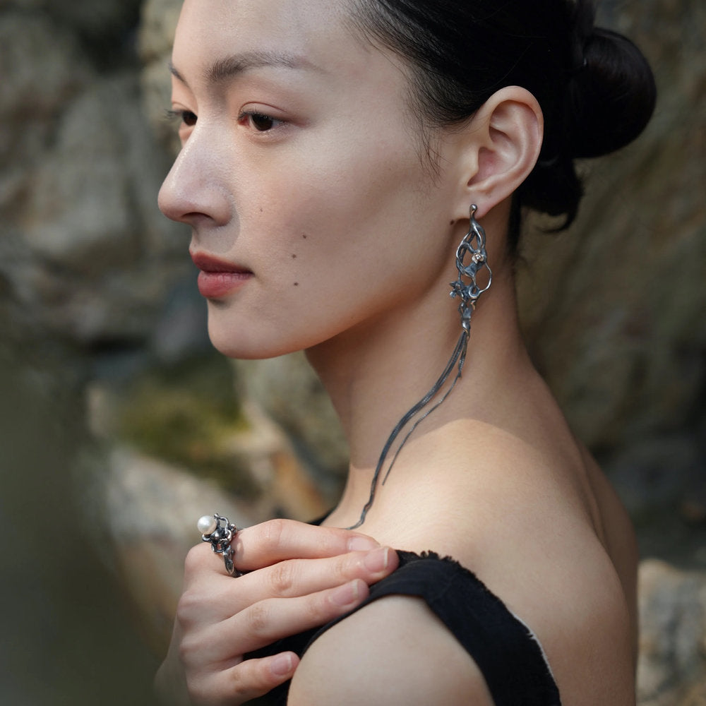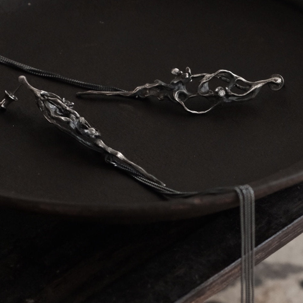 These sculptural oxidized silver earrings capture the flow of interlacing streams. Their open-cut design reveals a rhythmic balance between light and shadow, structure and movement.