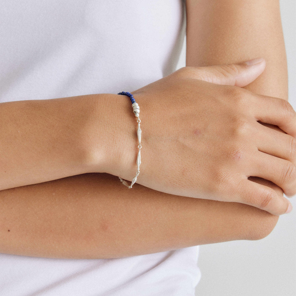 Balancing fluid silver forms with the deep glow of lapis lazuli, the Indigo Bracelet is a quiet statement of strength and protection.