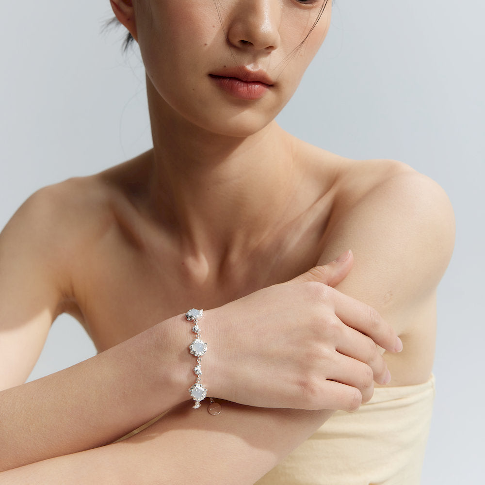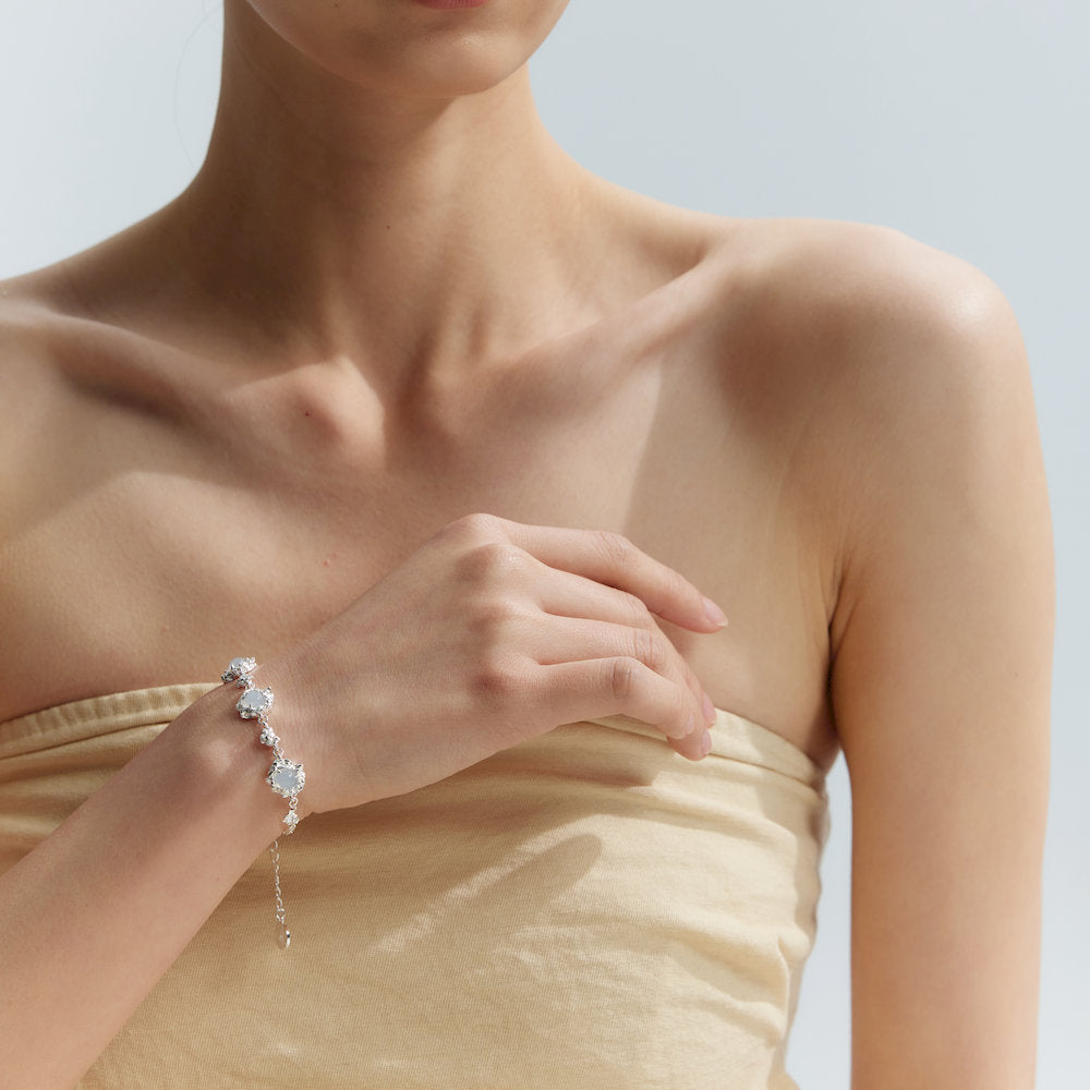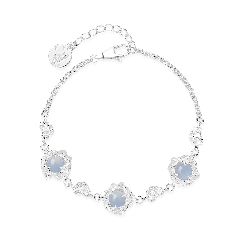 Blue chalcedony stones rest along a fine silver chain — like quiet ripples across a still lake, veiled in morning mist. Their soft translucence evokes serenity with a hint of mystery, offering a gentle calm that lingers through the day.