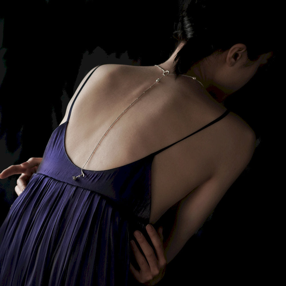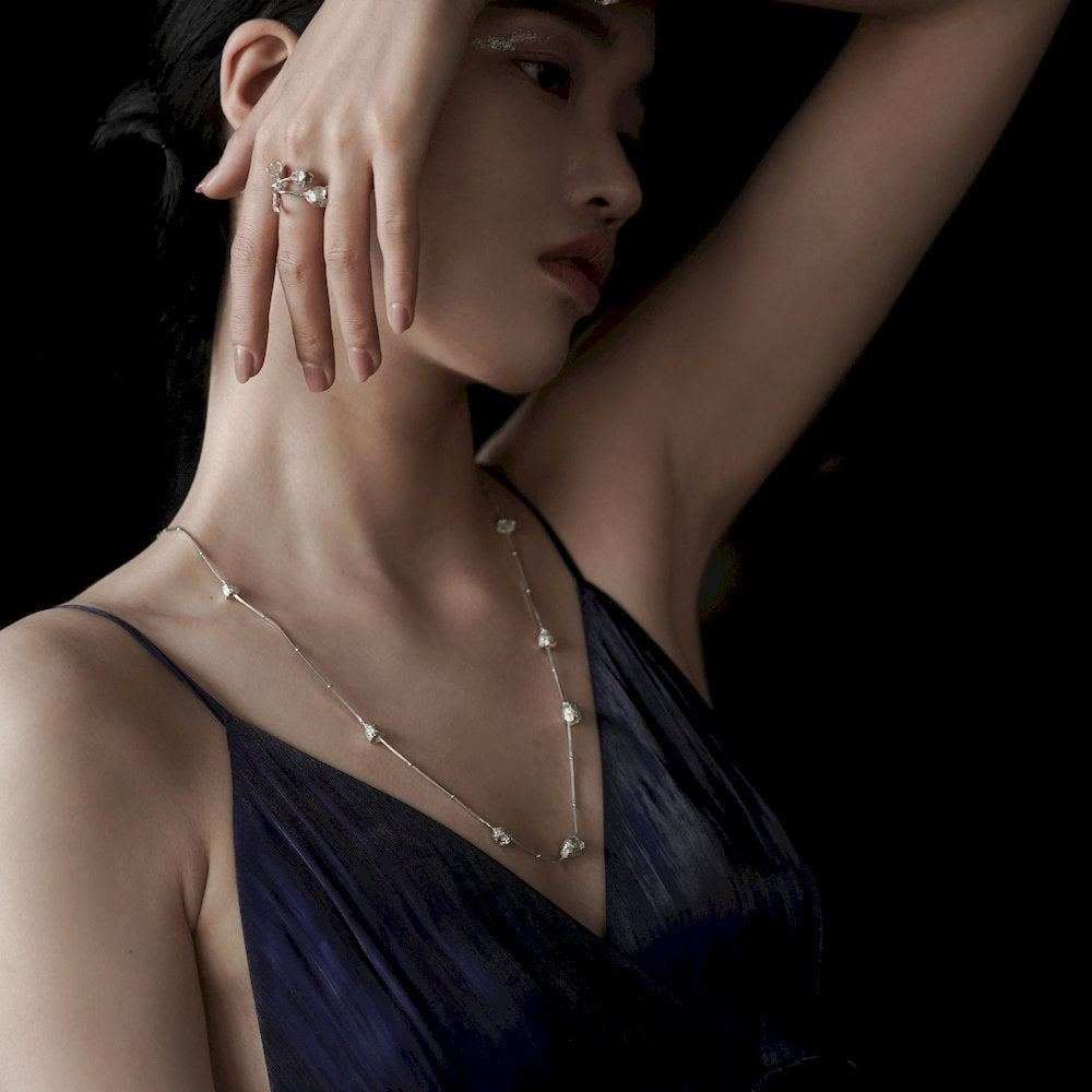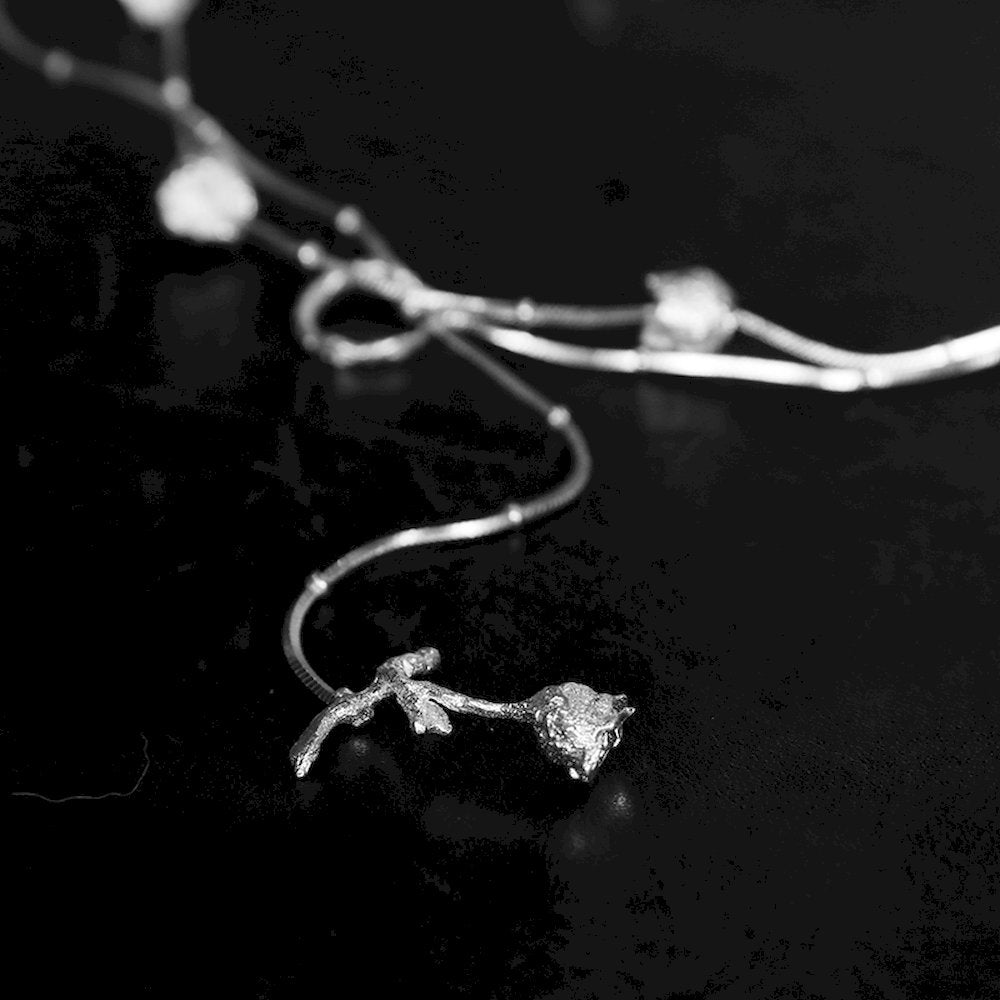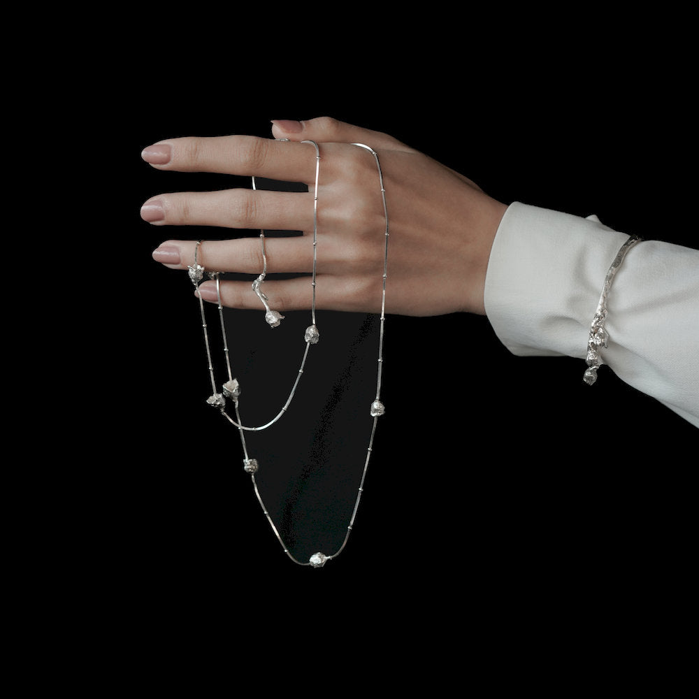 A graceful cascade of silver lily of the valley blossoms trails along a 70 cm chain — evoking purity, clarity, and quiet elegance. Inspired by the curved form of a single flowering stem, this design flows like spring wind in motion.