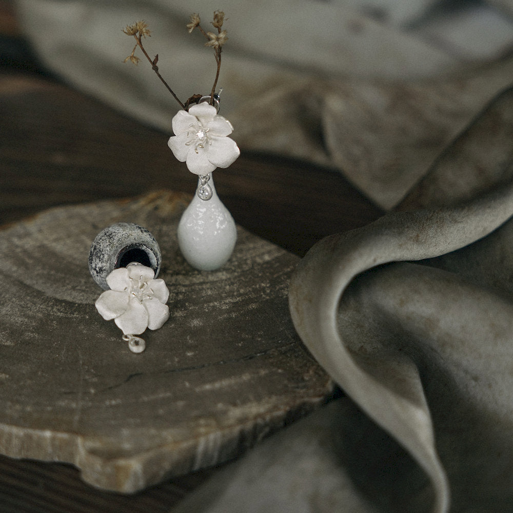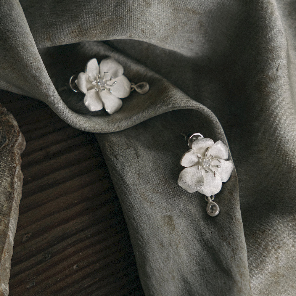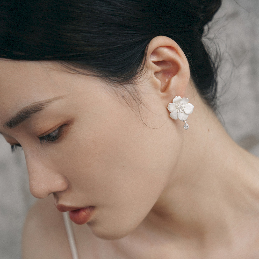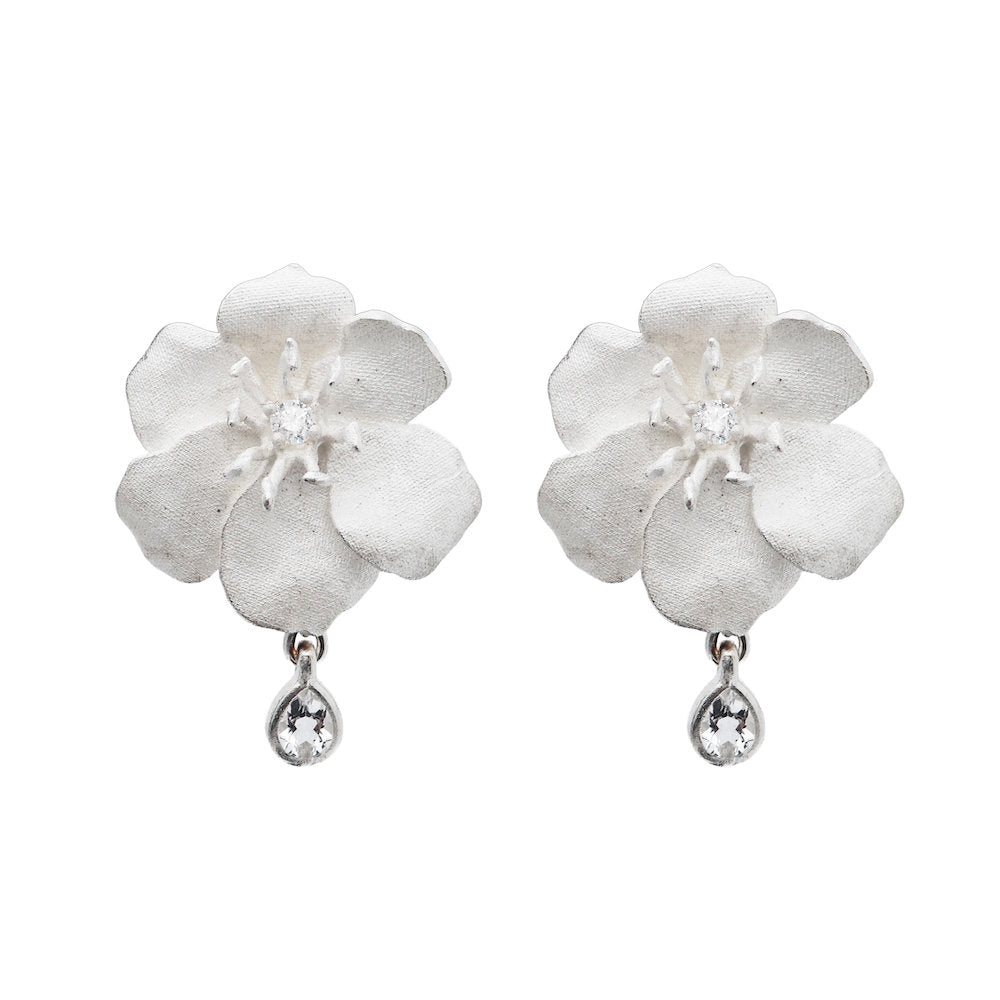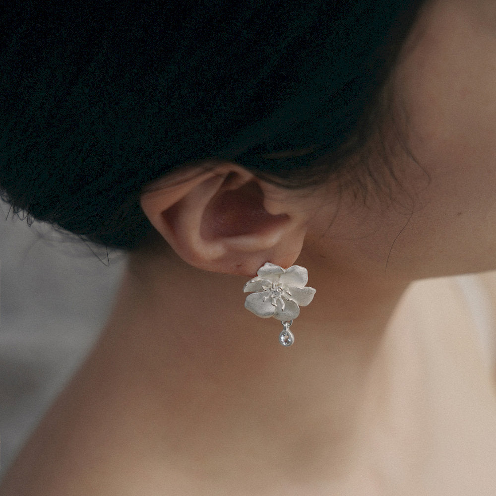 These delicate flowers bloom in softly matte sterling silver, with lightly carved petals that reflect the shape of real blossoms. A small zircon sits at the center, surrounded by fine pistil details. A white topaz drop hangs below, like a dewdrop resting on a petal.