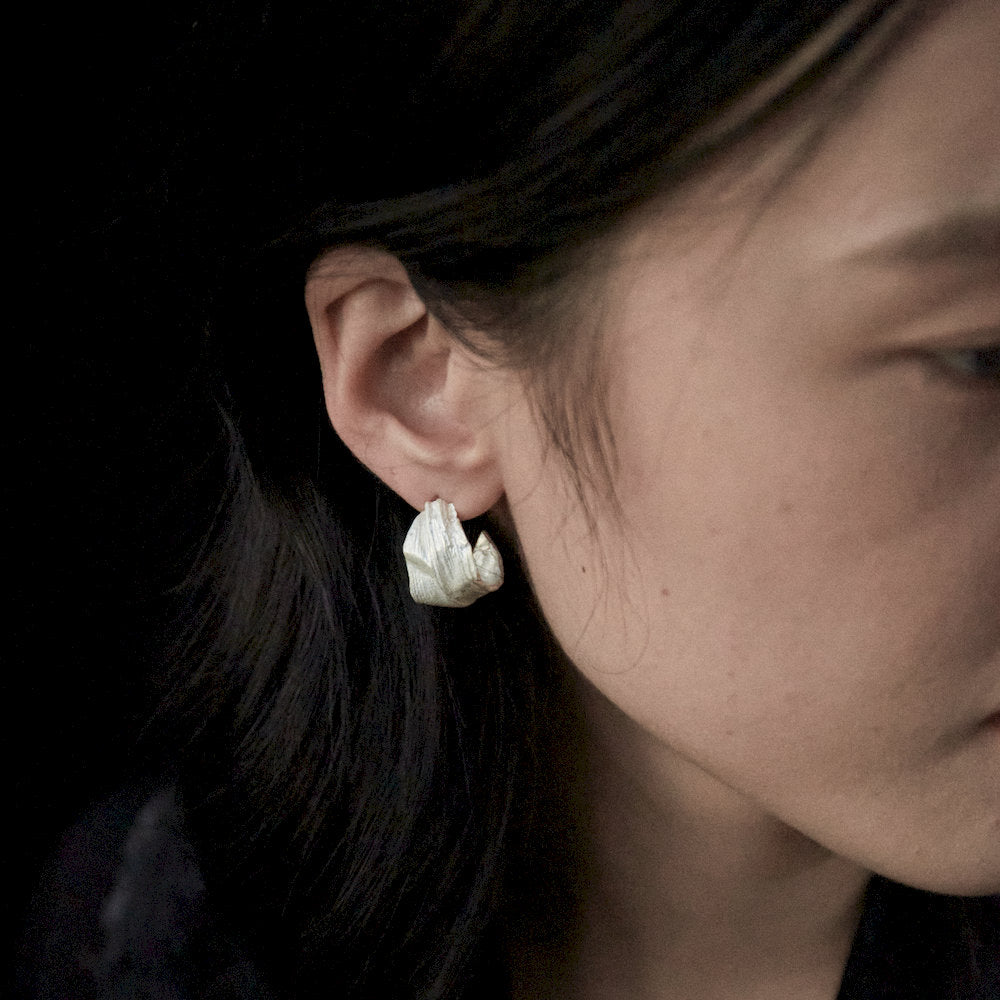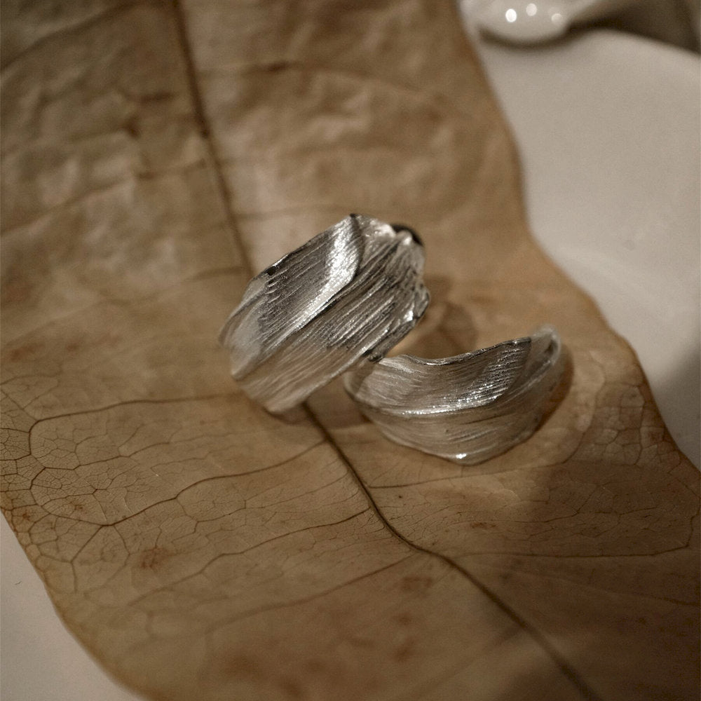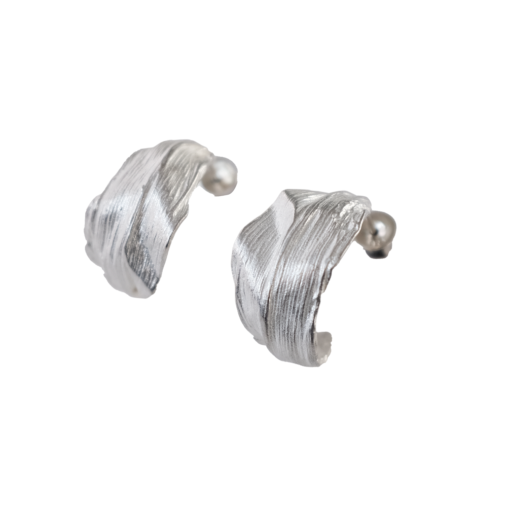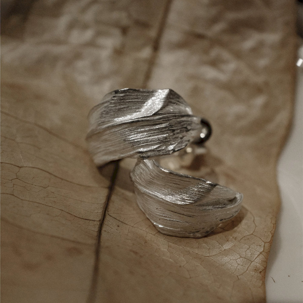 Sculpted with flowing, organic curves, these silver studs resemble withered leaves caught mid-fall — quiet yet full of strength. The hand-finished texture captures the essence of change and resilience, reflecting light in soft ripples.
